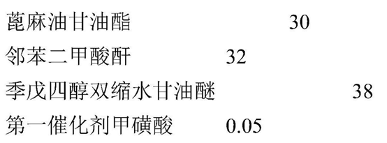 通入氮气保护的环境下,将蓖麻油甘油酯、邻苯二甲酸酐、季戊四醇双缩水甘油醚、第一催化剂甲磺酸搅拌混合,在180℃下反应2h,然后升温至230℃继续反应4h,降温至150℃,减压至R09;0.06Mpa反应1h,从而制得环氧树脂、蓖麻油甘油酯双重改性的改性聚酯多元醇。记作样品1。